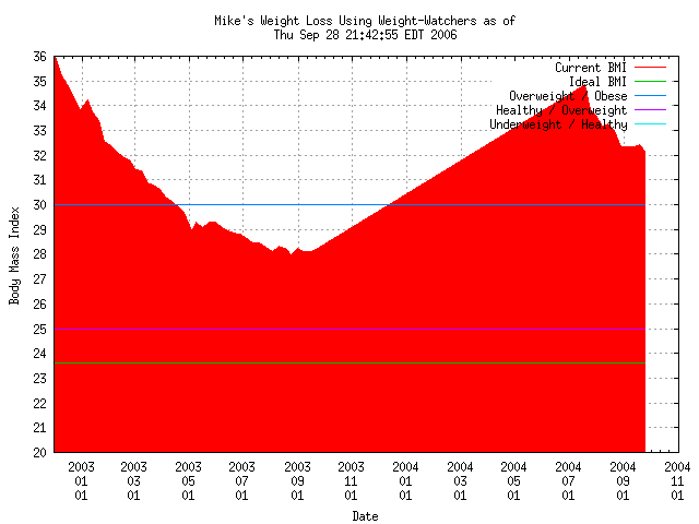 Well, obviously, I haven't gotten into the "ideal" range yet. In fact, I'm still in the "overweight" BMI range. As I lose more weight, it seems to get more difficult to keep the rate of weight loss as high as it was. In fact, back in May, I seemed to have plateaued for a while right around 210 pounds. I've also slacked off on following the WW diet closely of late, preferring to "guesstimate" my points usage for each day instead of recording what the actual points are. I've made a resolution to get back with following everything strictly, especially since I'm so close to breaking that 200 pound barrier. We'll see what happens...