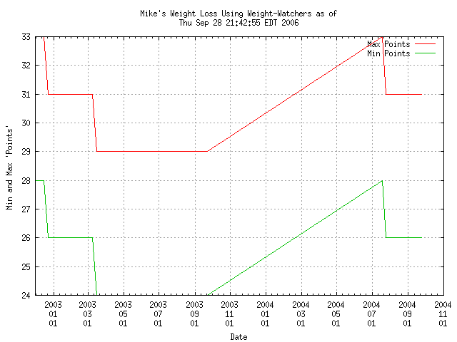 All in all, I'm currently averaging something around 2.5 pounds a week, which if I'm understanding correctly, is a "healthy" amount of weight loss. At my current rate, I'm estimating that I'll be reaching my "ideal" weight sometime around August 2003, at which point I should be able to go on "maintenance", which just means points are increased slightly, and I more or less stay there "forever", or until I start gaining weight again. Check back regularly, to see how it's going.