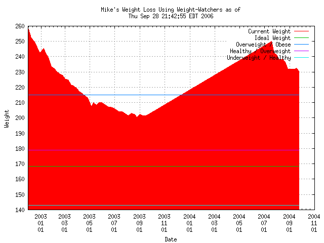 One other thing I should note, for those who are skeptical. I don't attend meetings. I don't like attending meetings, so I don't. I just have the books, the funky patented slide-rule thing for calculating points, and use my Palm to keep track of what I've been eating. I also don't tend to exercise much. I mean, I'll walk around a store, take a few strolls around the office, but I'm not out there exercising like a madman. I'm sure if I did, I'd likely see a more pronounced weight loss (or at least, be able to eat more, since activity gives you more points based on the strenuousness and duration), but I'm happy with my results.